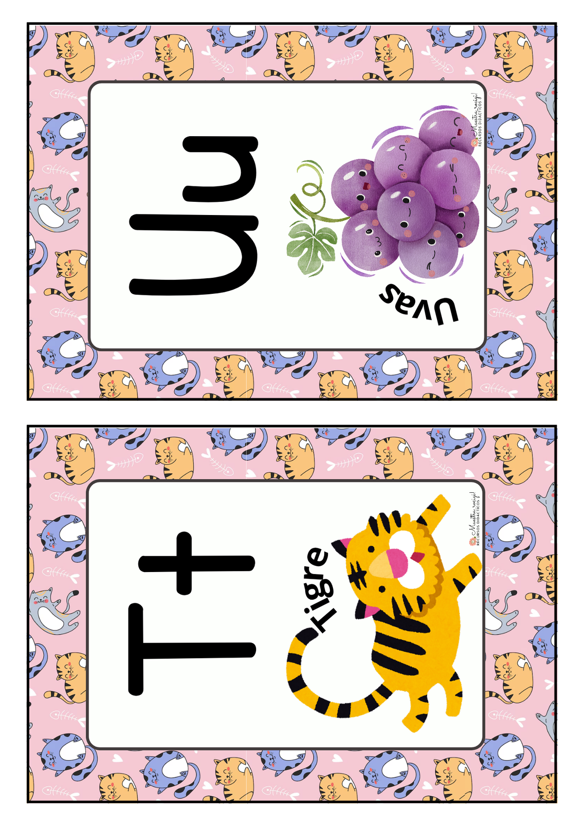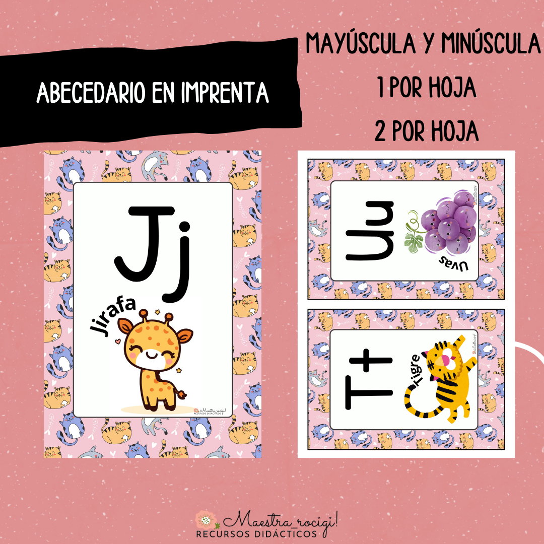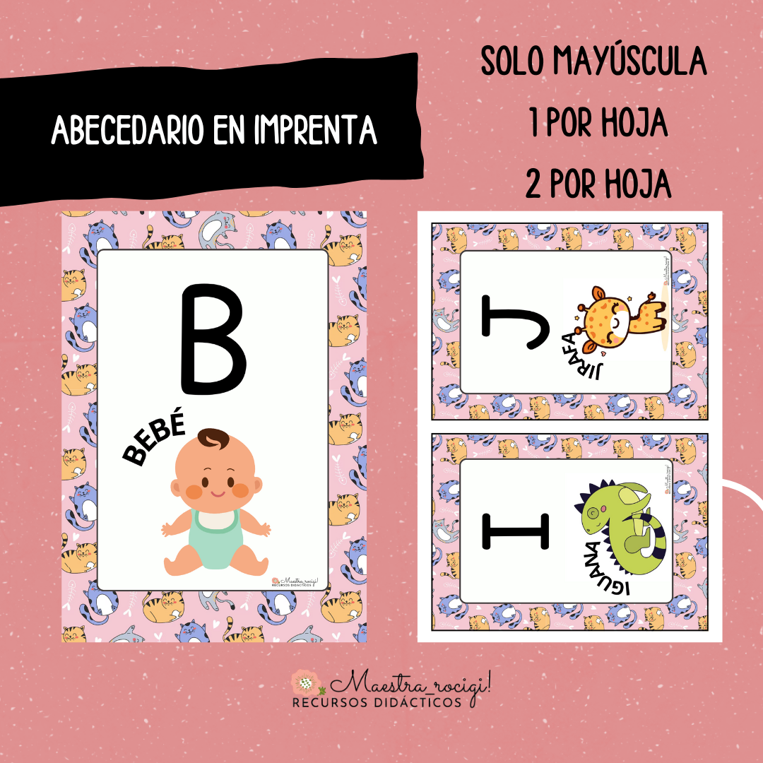 Abecedario en imprenta mayúscula y minúscula (1 letra por hoja, 2 letras por hoja)