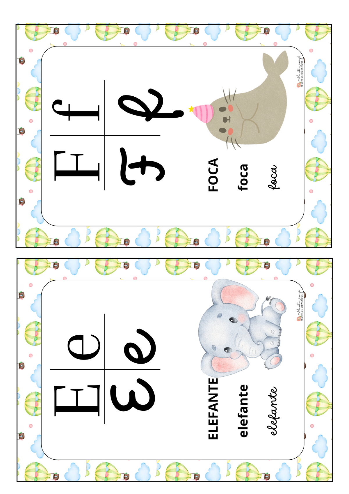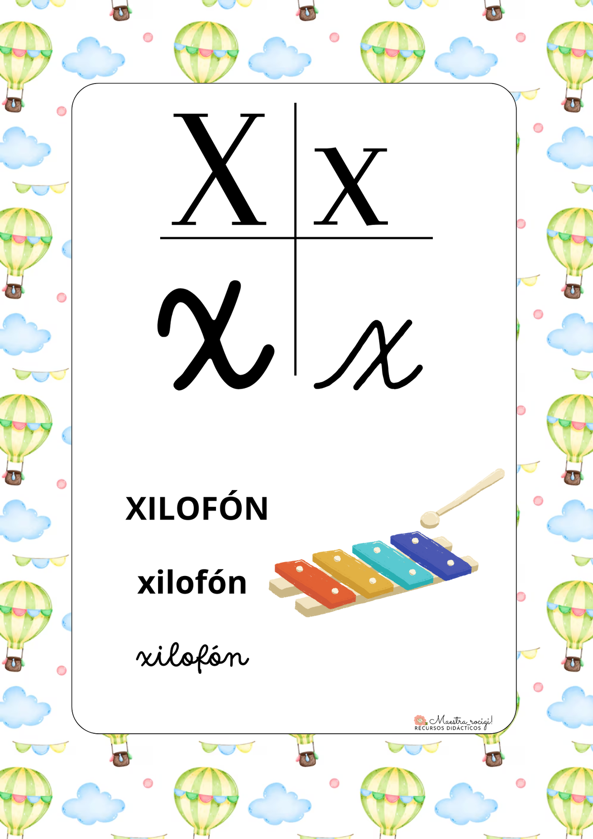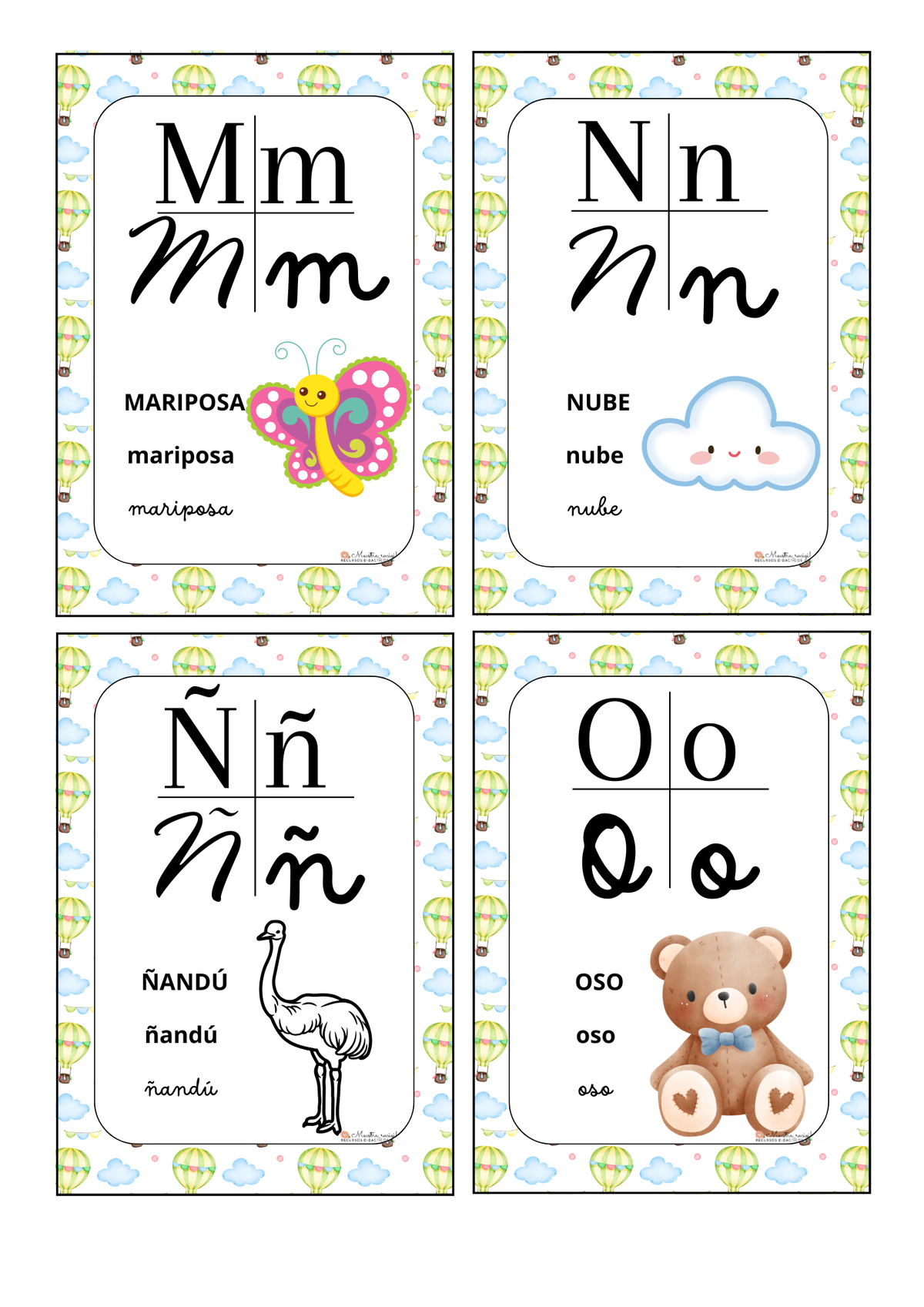 Abecedario con los 4 tipos de letras con borde decorativo globos aerostáticos