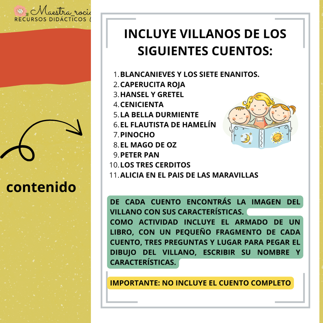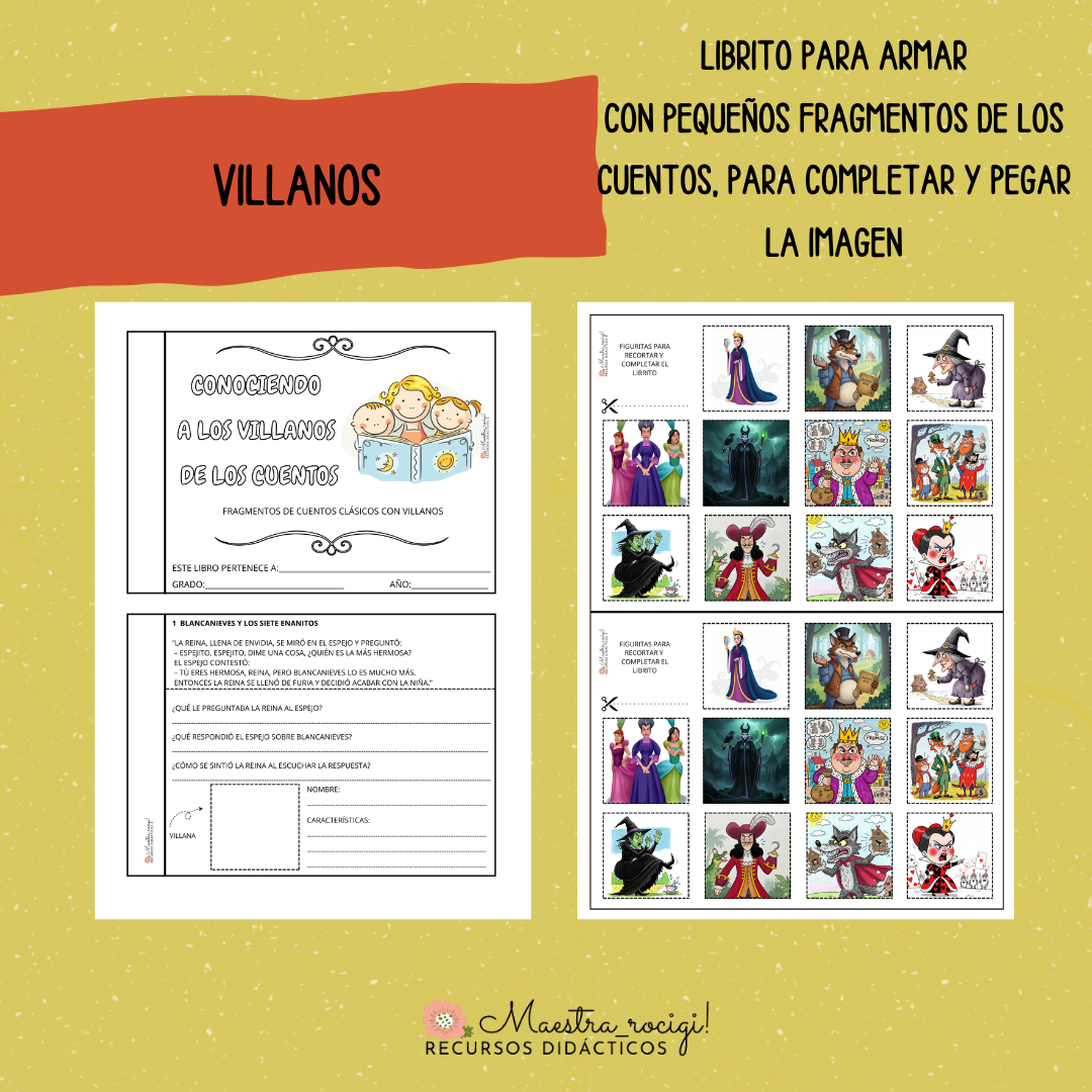 COMO ACTIVIDAD INCLUYE EL ARMADO DE UN LIBRO, CON UN PEQUEÑO FRAGMENTO DE CADA CUENTO, TRES PREGUNTAS Y LUGAR PARA PEGAR EL DIBUJO DEL VILLANO, ESCRIBIR SU NOMBRE Y CARACTERÍSTICAS.