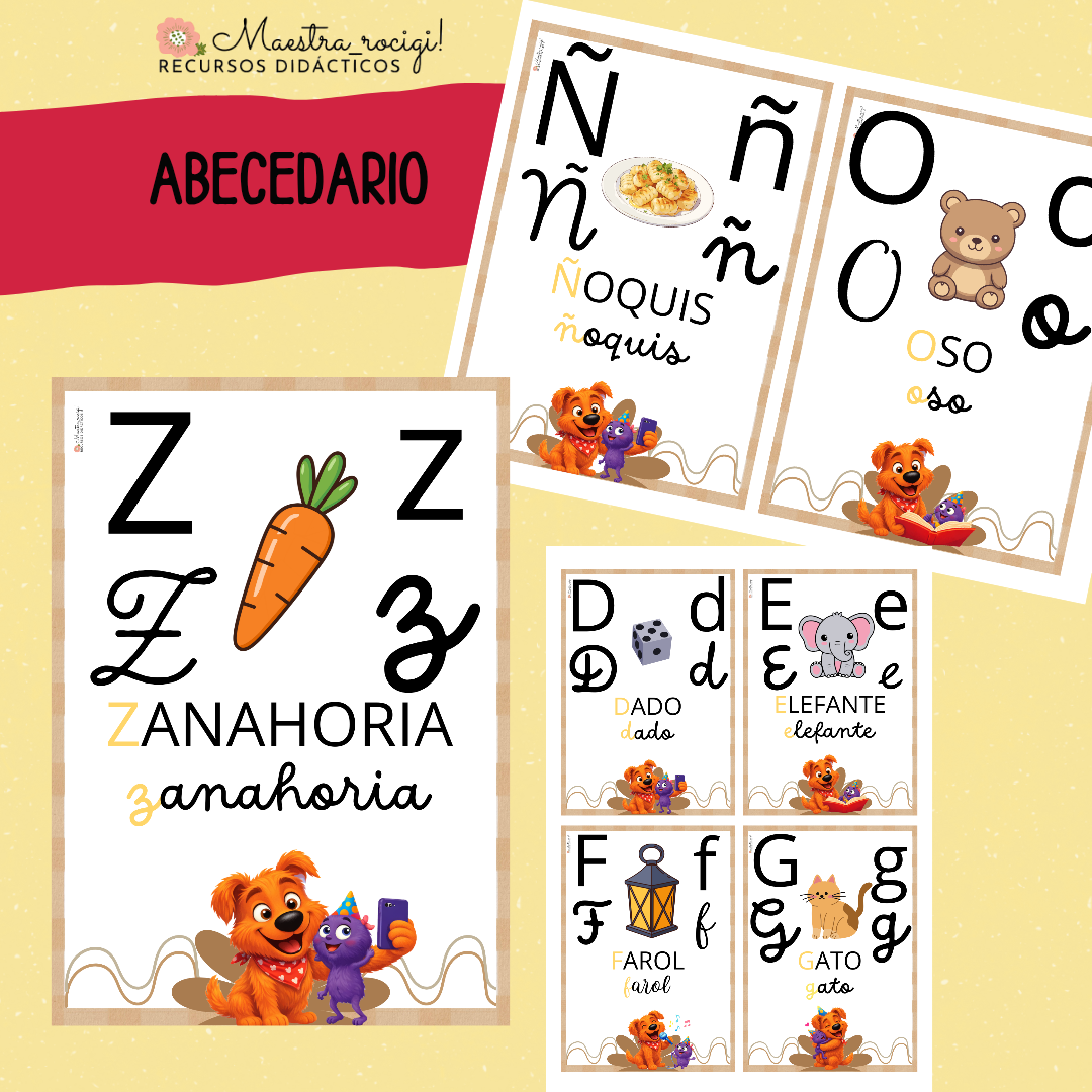 Abecedario 4 tipos de letras con dibujo de referencia. Temática TOTO Y SU AMIGA LA PULGA
