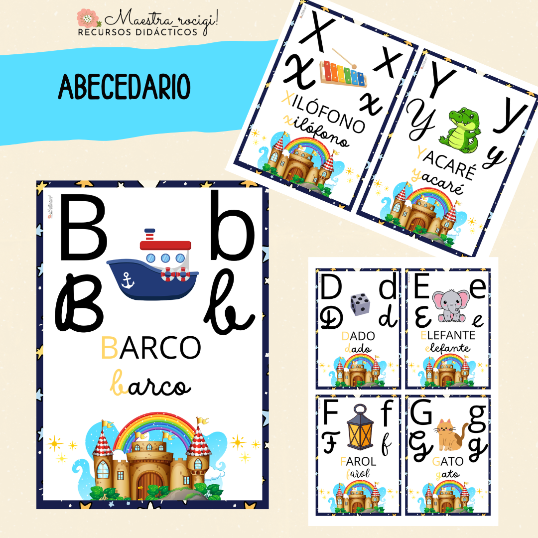 Abecedario 4 tipos de letras con dibujo de referencia. Temática TIERRAS MÁGICAS