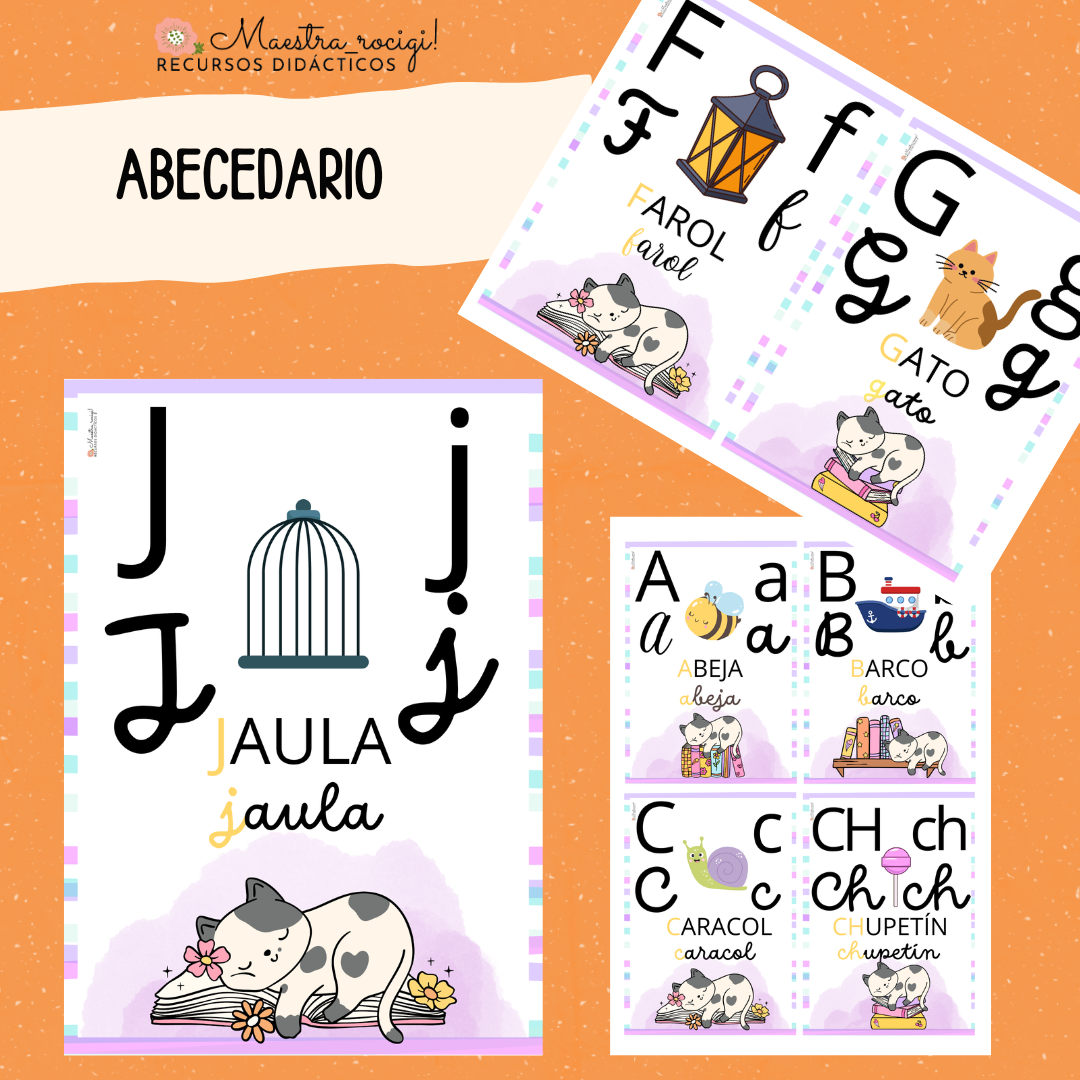 Abecedario 4 tipos de letras con dibujo de referencia. Temática GATITOS