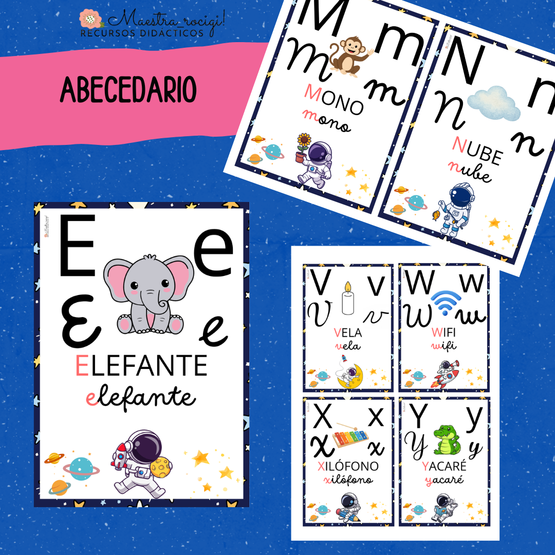 Abecedario 4 tipos de letras CON dibujo de referencia. Temática ASTRONAUTA