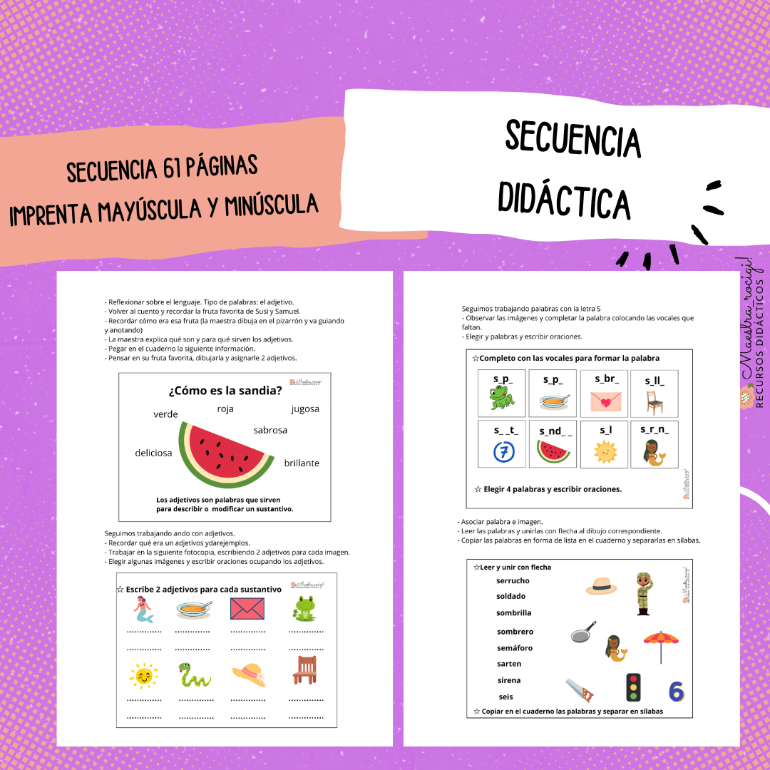 Actividades secuenciadas: leer, completar palabras, completar con vocales, reconocer palabras del cuento, adjetivos, escribir listas.